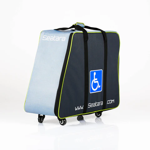 The WheelAble carry case has a corduroy exterior, a sturdy interior and an inner lining of waterproof, mould-preventing fabric. It is on wheels and is marked with the universal wheelchair symbol for transportation. It has lifting straps and an opening at the top to lift the product when loading and a zipper along three sides which enables the user to easily open the case unassisted.